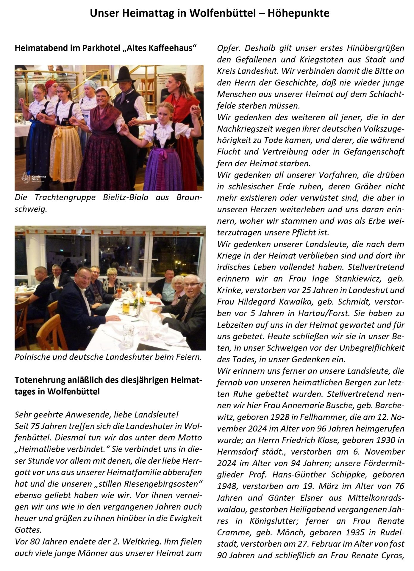 Den Auftakt des Programms in Wolfenbüttel bildet am Freitagabend ab 18 Uhr eine Autorenlesung mit der Journalistin Hilke Lorenz im Ratssaal des Wolfenbütteler Rathauses. Sie wird aus ihrem Buch „Heimat aus dem Koffer – Vom Leben nach Flucht und Vertreibung“ lesen. Zuvor gibt es dort ab 16:00 Uhr die Möglichkeit, sich zu Familienforschung in den früheren deutschen Ostgebieten beraten zu lassen und an Führungen zum Thema „Ankunft der Vertriebenen in Wolfenbüttel nach 1945“ teilzunehmen. Am Samstagabend findet im ParkhotelAltes Kaffeehaus unser Schlesischer Heimatabend statt. Ein gemütliches Beisammensein bei von der Zither begleiteten schlesischen Liedern und Gedichten mit der Möglichkeit zum Kennenlernen. Begleitet wird der Abend von der Trachten- und Volkstanzgruppe Bielitz-Biala. Auch unsere polnischen Freunde aus dem Ostriesengebirge werden anwesend sein und den Abend bereichern.