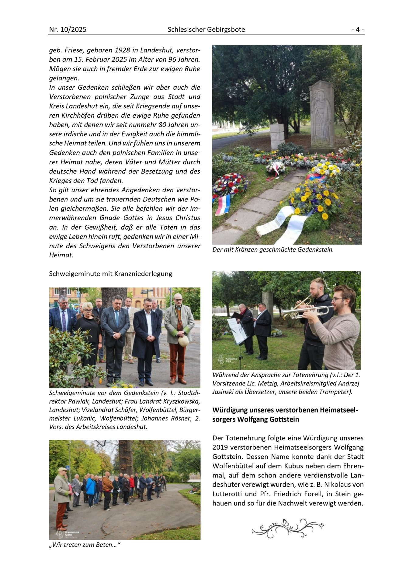 Unser Heimatseelsorger, Senior des Arbeitskreises und Ehrenbürger seiner Heimatstadt Landeshut/ Kamienna Góra, Wolfgang Gottstein, verstarb am 17. Dezember 2019 in Stuttgart und wurde am 9. Januar 2020 an früherer Wirkungsstätte in Ulm-Eggingen beigesetzt. Seit den Adventstagen 1976 hatte aus den Reihen der heimatvertriebenen Landeshuter er die Pionierarbeit deutsch-polnischer Verständigung begonnen. Im Schlesischen Gebirgsboten erschien ein Bericht von den Trauerfeierlichkeiten. Der Arbeitskreis wird Wolfgang Gottstein ein ehrendes Andenken bewahren.