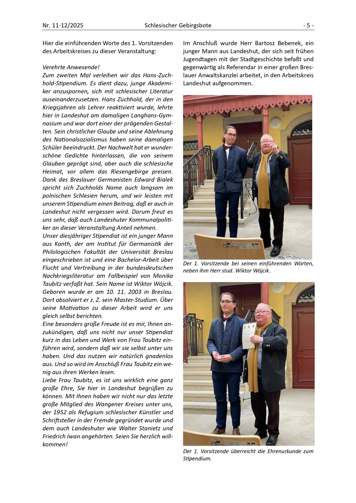 Am 30.09.2024 wurde im Rahmen einer Lesung im Webereimuseum erstmals das mit Unterstützung von Patenstadt und Patenkreis Wolfenbüttel ausgelobte Hans-Zuchhold-Stipendium an die Breslauer Germanistikstudentin Michelle Sakowicz vergeben.
